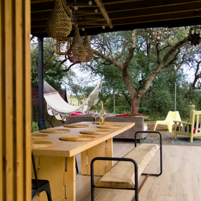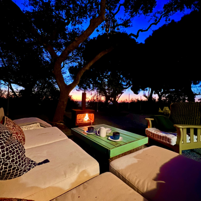 Zona con sofás y chimenea exterior, donde respirar aire puro mientas disfrutas de una buena conversación o del silencio al abrigo de una encina centenaria